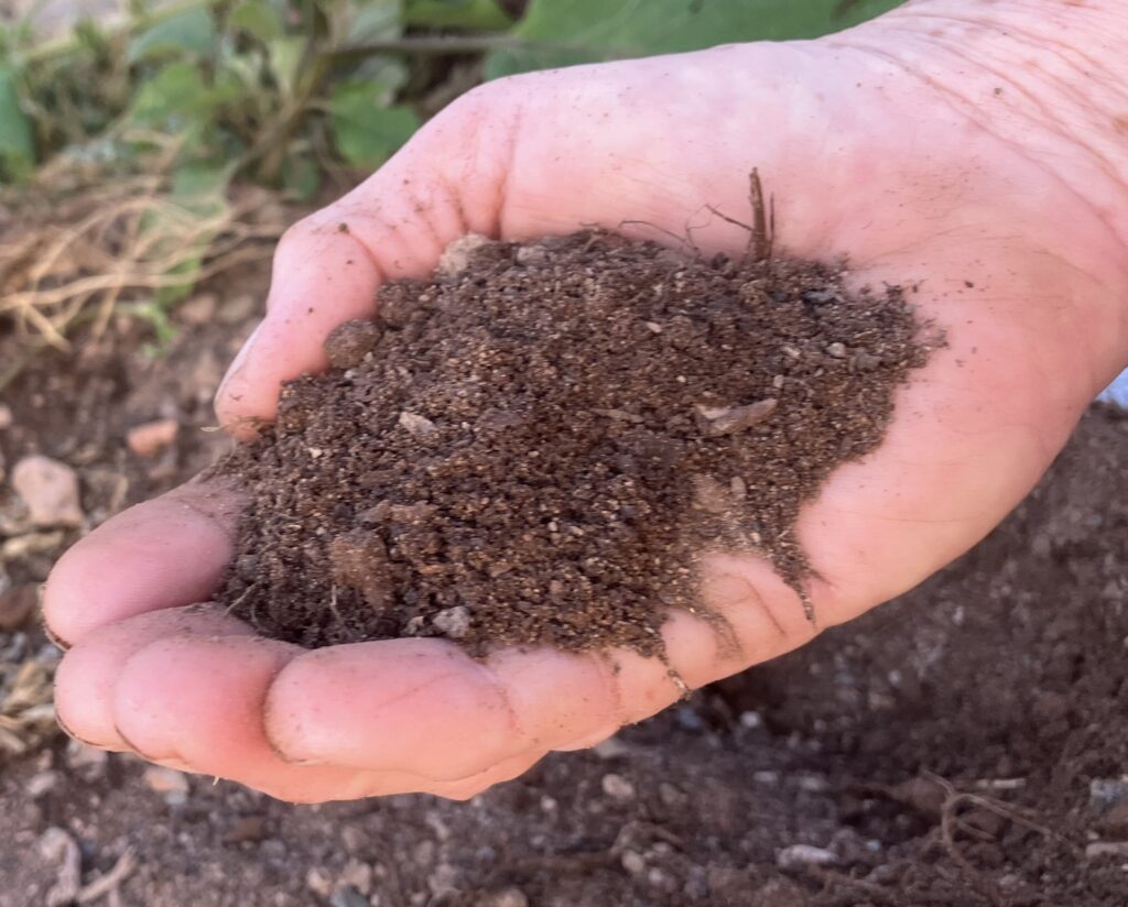 We gauge how good our soil is largely by how sandy or clayey its texture is, and it’s good to see a darker brown colour, which indicates a good amount of organic matter.